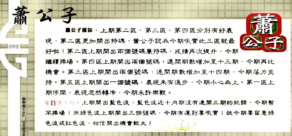 主题 :093期:六合皇金句/老总论码/萧公子/林大师/五行夺码/老总信箱截 |