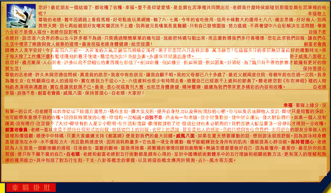 →〖創富老會員〗:老總一直以來是不期待任何形式的回報,包括物質上的回報、名譽上的讚揚,甚至是他人的感謝。目的只想與各位會員們、志同道合的朋友分享做人的道理和價值觀,順便中中特碼,只要大家繼續支持《創富網》便是對我們的最大回饋。