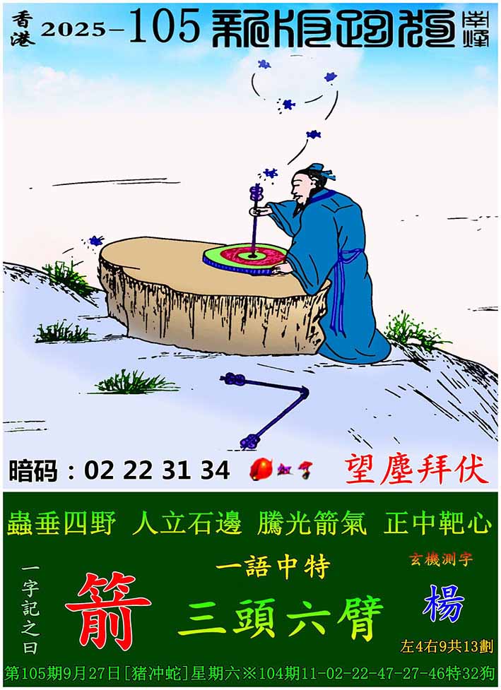 | 主题 :105期:新版跑狗一字記之曰【箭】 玄機測字:【楊】 |